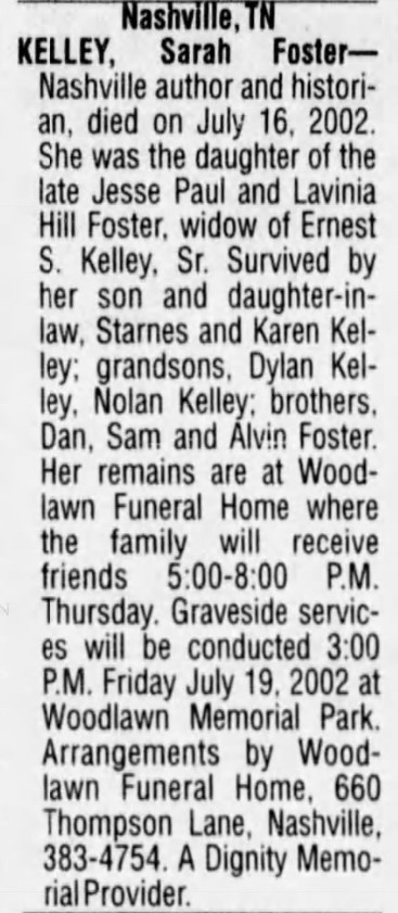 Sadly, on July 16, 2002, in Nashville, TN, Sarah died of cancer. She was buried at Woodlawn Memorial Park and Mausoleum, in Nashville, TN. When she died, she donated a large amount of her research materials to the Nashville, TN library.