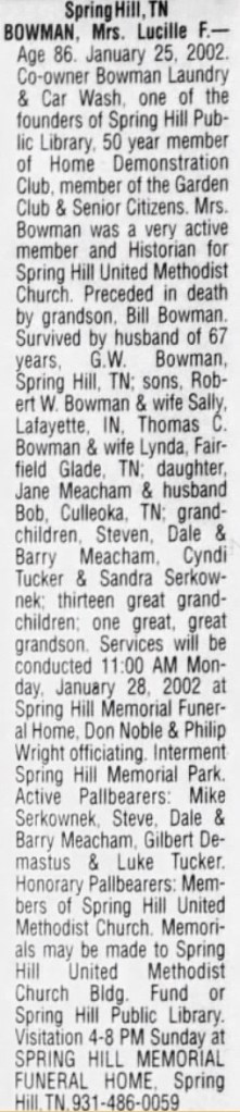 Sadly, on January 25, 2002, in Spring Hill, TN, Lucille Mildred Bowman died. She was buried at Spring Hill Memorial Park in Spring Hill, TN. People in the city of Spring Hill, TN still remember Lucille Bowman as a good friend to this day.