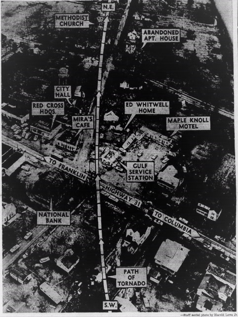 “THE TORNADO AND DR. TOMMY KINNARD—The Spring Hill tornado is not all that far back, but this story is so funny that I just have to tell it. It occurred sometime between twelve and two o’clock at night. Out at my house and Early’s Honey Stand, it didn’t blow hard enough to blow your hat off. We didn’t know anything about the tornado till about seven o’clock the next morning. Mr. Terry Parks and his wife lived in a small house I owned, and Terry worked for me in my business. Terry owned a home on Lake Avenue, right next door to Dr. Tommy Kinnard. The police were at each end of town directing traffic, and a strict “no sight seeing” order was in effect. Being in the mail order business I just had to try to get to the post office to pick up my mail. Terry asked me to try to get on through town to check on his house on Lake Avenue. The policeman knew me and Terry, so I didn’t have too much trouble in securing permission to do so. My wife Edith, went with me. Picking up my mail, we went over to Lake Avenue to check Terry’s house for damage. There was none. Less than five hundred feet up the street, two home had been destroyed and big trees uprooted. We didn’t see any sign of life at Dr. Kinnard’s house. So we were just walking around his house, looking for damage, when the front door opened and Dr. Tommy came out in his housecoat with a sleepy look on his face. With a puzzled look on his face, he said “Wont you and Edith come in?” “I guess not,” I replied. “We were just looking for any damage to your house.” “Damage? What damage?” He said. “From the tornado,” I replied. “What tornado?” He said, with a surprised look in his face. Right across the street as far as the eye could see were buildings blown down and huge trees blown over. Bulldozers were pushing things around and scores of chain saws were sounding like mad hornets. National Guard trucks and equipment were everywhere When he asked, “What tornado?” I replied by just pointing to the war-zone-like destruction before him. He studied the scene for about fifteen seconds, then grabbed his glasses out and put them on. His mouth flew open in surprise. He started yelling, “Virginia, come here. There’s been a tornado!” And his wife had slept right through the whole storm!” – Erskine Early, page 122.