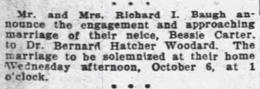 On October 6, 1909, in Giles County, TN, Bernard married Bessie Carter. They had 4 children, and their names were: Anne Elizabeth (Woodard) Anderson, Dr. Bernard Hatcher Woodard Jr., Milton Carter Woodard, and James Edward Woodard.