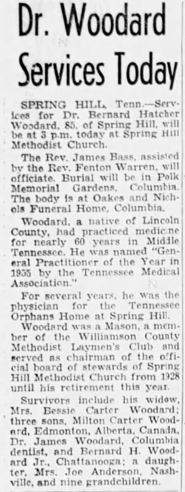 Sadly, on November 19, 1966, in Maury County, TN, Bernard died of a heart attack. He was buried in Polk Memorial Gardens cemetery in Maury County, TN. People still remember him as the great doctor he was, and the stories told of him will never be forgotten.