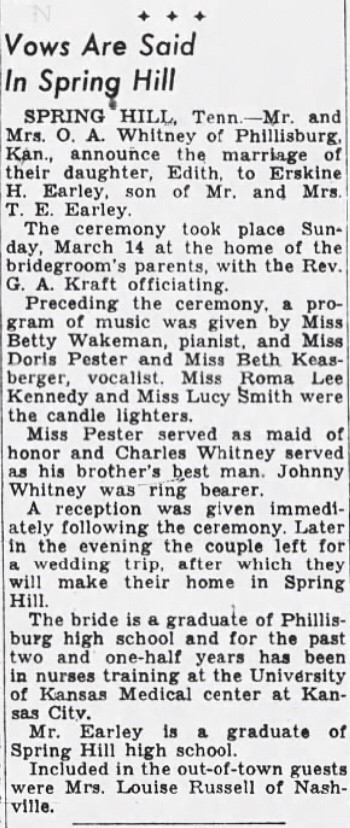 On March 14, 1948, in Spring Hill, TN, Erskine married Edith Whitney. They had two sons. Their names are Stephen “Steve” and Douglas. Erskine and his family lived in Williamson County, TN on Highway 31, near the honey stand.