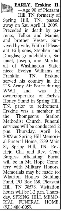Sadly, on April 11, 2009, in Pleasant Hill, Cumberland County, TN, Erskine died. He was buried in Mount Hope Cemetery in Franklin, Williamson County, TN, where his wife would later be buried in 2014.
