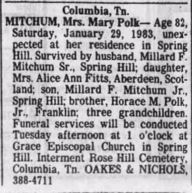 Sadly, on January 29, 1983, in Columbia, Maury County, TN, Mary died. She was buried in Rose Hill Cemetery in Columbia, Maury County, TN. Mary’s church, Grace Episcopal Church, still stands and still has services to this day.