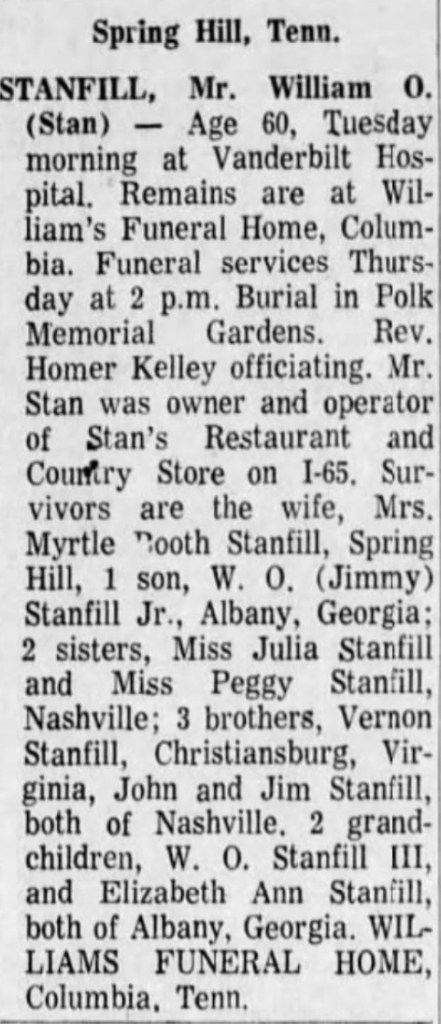 Sadly, on April 17, 1973, in Spring Hill, TN, Stan died. He was buried at the Polk Memorial Gardens cemetery. I have had the privilege to meet Stan’s grandson, Bill Stanfill, who owns Middle Tennessee Paintball with his wife, my distant cousin, Janice.