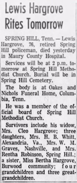 Sadly, on May 2, 1967, at the Maury Regional Hospital, in Columbia, Maury County, TN, Lewis died. He was buried at Spring Hill Cemetery, in Spring Hill, TN. Some people still remember Lewis being the Police Chief and shopping at his general store on Main Street.