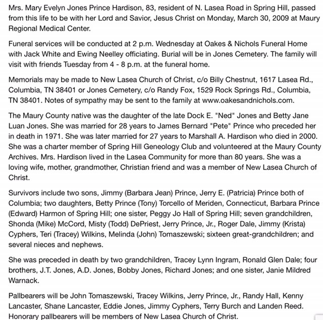 Sadly, on March 30, 2009, in Maury County, TN, Evelyn died. She was buried at Jones Cemetery in Lasea, Maury County, TN.