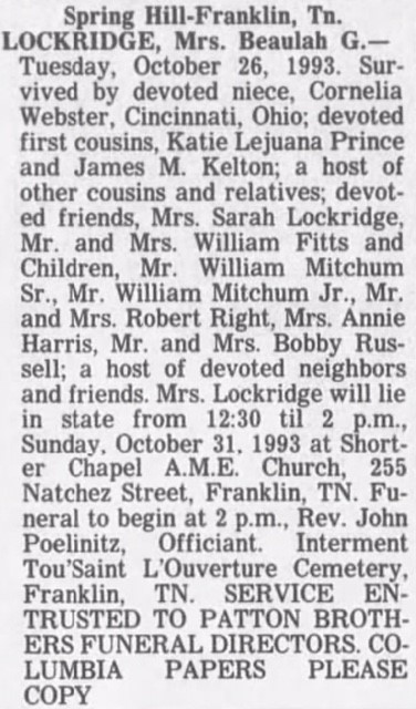 Sadly, on October 26, 1993, in TN, Beulah died. She was buried in Toussaint L’Ouverture Cemetery, in Franklin, Williamson County, TN. Beulah was loved by everybody that knew her, and is to this day remembered by them.