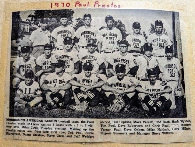 In around 1969, outside Vernon’s family home at 602 North Madison Street, in Morrison, Illinois, playing baseball we’re children. After playing for a little while, a rogue baseball went through and broke one of his home’s windows. That inspired Vernon to create a baseball team for all of the city’s children. Vernon still had a lot to plan though, they still needed a name and a place to play. Vernon and his wife Ardath, after thinking for some time, came up with the perfect name, the Paul’s Prestos. Paul meaning Vernon, and Presto, a musical term for fast. The team’s first baseball field was located at the high school, but that wasn’t a great fit, so they moved to the junior high baseball field. Later the city of Morrison, Illinois, allowed them to use land given by the American Legion to build a baseball park, which is now known as Kiwanis Park. The Paul’s Prestos went on to play many years until their last season came along in 1982. Vernon spent a lot of his time and money on his team, and it was all because of his love for sports and a rogue baseball.