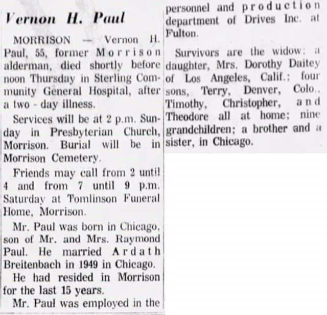 After Vernon and Ardath’s son, Tim, was born, they decided they didn’t want to raise their children in Chicago, Illinois, so they drove west on highway route 30 and eventually found Morrison, Whiteside County, Illinois. They knew that was going to be the place they would reside with their growing family. Sometime after, Vernon became an alderman for the city as he would be for many years. He also, in around 1967, ran for mayor, but he unfortunately lost by one vote due to him wanting to shut down the taverns on Sundays. Alongside being an alderman, he was a piano tuner, which was caused by Ardath being a piano teacher, and many other jobs, but the one that I think stands out the most though is him being a member of the Toastmasters International organization. Vernon was a well-respected man of Morrison, Illinois.