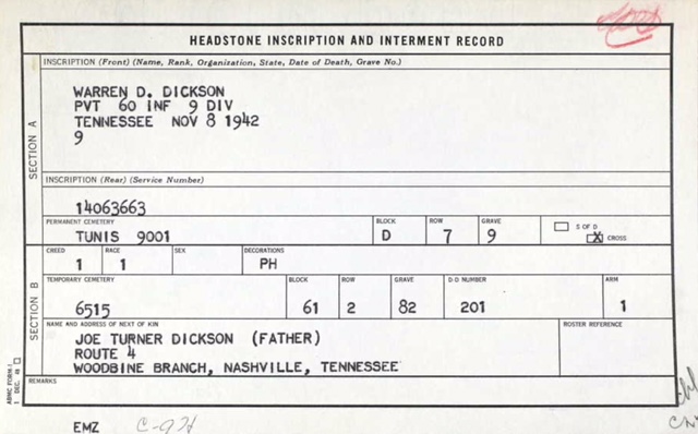 Pvt. Warren Dale Dickson was born in 1921, in TN, to Joe Turner Dickson and Effie Zulena Stewart. He had 7 siblings, and their names were Robert Turner Dickson, Anna Louise (Dickson) Jett, Nellie Vernon (Dickson) Jett, Tec5 Charlie Jefferson Dickson, Helen Elizabeth Dickson, Pfc. Gladney Owen Dickson, Christine Josephine (Dickson) Green, and Mary M. Dickson. The Dickson Family lived on Nolensville Road in the Woodbine Community of Nashville, TN.